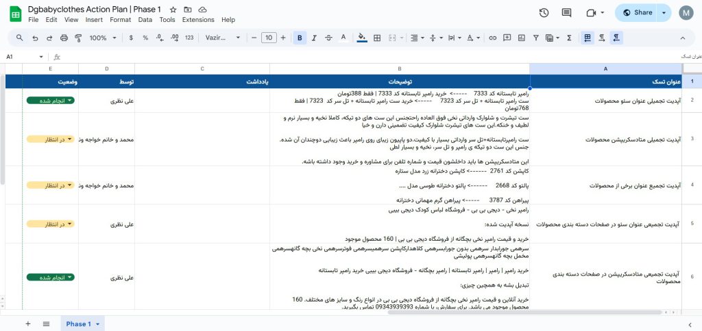 برای همین من برای همه پروژه ها اکشن پلن درست میکنم تا کار حرفه ای جلو بره، چنتا از مثال هاشو میتونید این زیر ببینید.