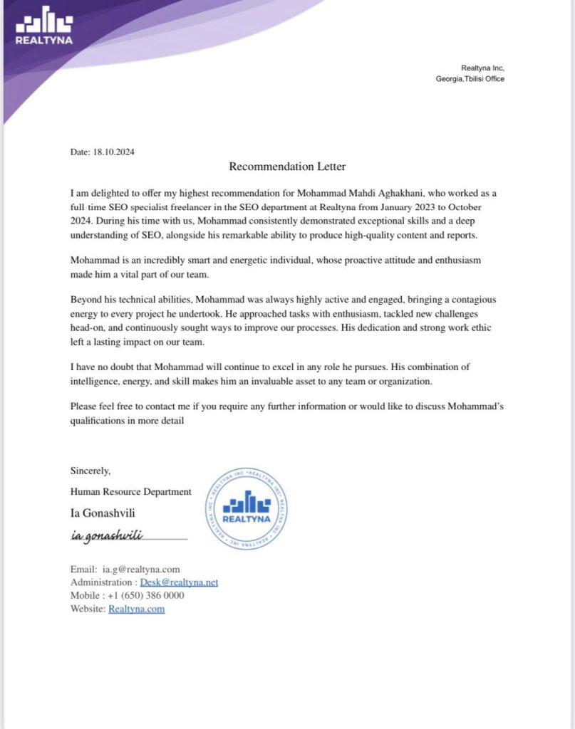 توی شرکت Realtyna که بودم، تمامی موارد مربوط به سئوی پلاگین WPL، قالب Lavender و همینطور محصول MLS ON THE FLY با بنده بود.